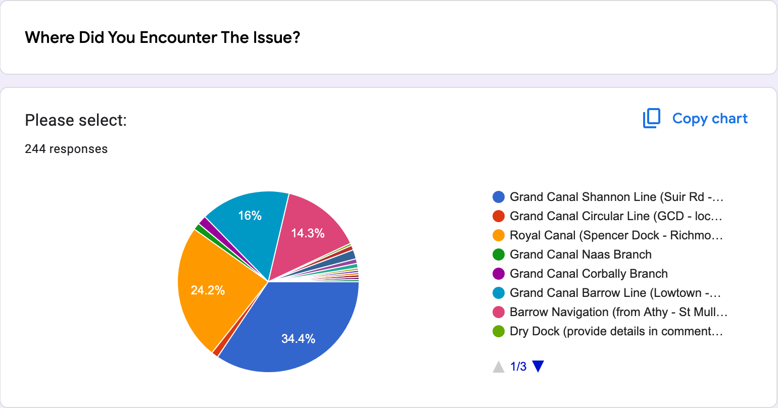 The following chart(s) data corresponds with the order of the questions you encounter in the Nav-Watch Survey. There’s a wealth of information here which can only be useful for WI engineers as they plan works. Do send us your feedback as well as your logs, it’s all useful information, e.g. one boater reported back in late May 2025 that issues they had encountered on their outbound journey along the Barrow had almost all been resolved when they returned a couple of months later.