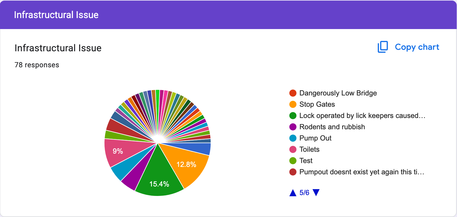 The following chart(s) data corresponds with the order of the questions you encounter in the Nav-Watch Survey. There’s a wealth of information here which can only be useful for WI engineers as they plan works. Do send us your feedback as well as your logs, it’s all useful information, e.g. one boater reported back in late May 2025 that issues they had encountered on their outbound journey along the Barrow had almost all been resolved when they returned a couple of months later.